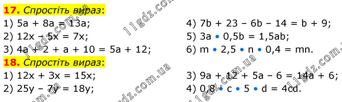 17. Спростіть вираз: 1) 5а + 8а = 13а; 2) 12х – 5х = 7х; 3) 4а + 2 + а + 10 = 5а + 12; 4) 7b + 23 – 6b – 14 = b + 9; 5) 3a • 0,5b = 1,5ab; 6) m • 2,5 • n • 0,4 = mn. 18. Спростіть вираз: 1) 12х + Зх = 15х; 2) 25у – 7у = 18у; 3) 9а + 12 + 5а – 6 = 14а + 6; 4) 0,8 • с • 5 • d = 4cd.