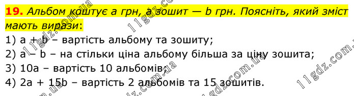 Альбом коштує а грн, а зошит — b грн. Поясніть, який зміст мають вирази: 1) а + b – вартість альбому та зошиту; 2) a – b – на стільки ціна альбому більша за ціну зошита; 3) 10a – вартість 10 альбомів; 4) 2a + 15b – вартість 2 альбомів та 15 зошитів.