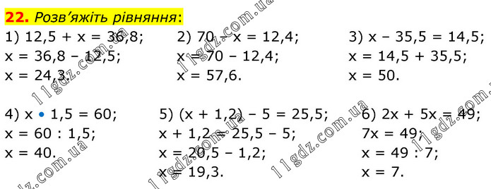 Розв’яжіть рівняння: 1) 12,5 + х = 36,8; х = 36,8 – 12,5; х = 24,3. 2) 70 – х = 12,4; х = 70 – 12,4; х = 57,6. 3) х – 35,5 = 14,5; х = 14,5 + 35,5; х = 50. 4) х • 1,5 = 60; х = 60 : 1,5; х = 40. 5) (х + 1,2) – 5 = 25,5; х + 1,2 = 25,5 – 5; х = 20,5 – 1,2; х = 19,3. 6) 2х + 5х = 49; 7х = 49; х = 49 : 7; х = 7.