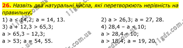 Назвіть два натуральні числа, які перетворюють нерівність на правильну. 1) а < 14,2; а = 14, 13. 2) а > 26,3; а = 27, 28. 3) а + 12,3 > 65,3; а > 65,3 – 12,3; а > 53; а = 54, 55. 4) 28,4 – а < 10; а > 28,4 – 10; a > 18,4; а = 19, 20.