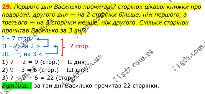 Першого дня Василько прочитав 7 сторінок цікавої книжки про подорожі, другого дня — на 2 сторінки більше, ніж першого, а третього — на 3 сторінки менше, ніж другого. Скільки сторінок прочитав Василько за 3 дні? І – 7 стор. ІІ – ?, на 2 > ? стор. III – ?, на 3 < 1) 7 + 2 = 9 (стор.) – ІІ дня; 2) 9 – 3 = 6 (стор.) – ІІІ дня; 3) 7 + 9 + 6 = 22 (стор.) Відповідь: за три дні Василько прочитав 22 сторінки.
