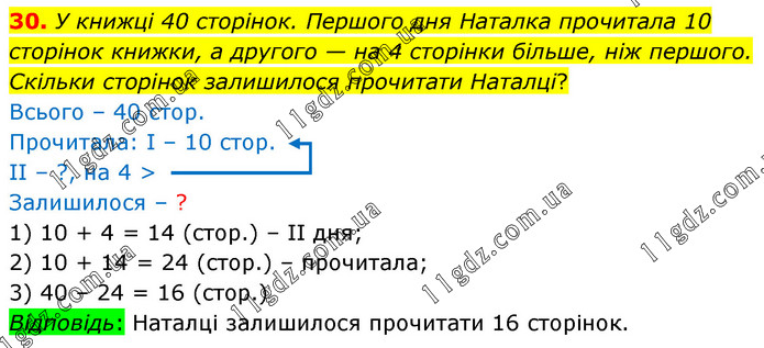 У книжці 40 сторінок. Першого дня Наталка прочитала 10 сторінок книжки, а другого — на 4 сторінки більше, ніж першого. Скільки сторінок залишилося прочитати Наталці? Всього – 40 стор. Прочитала: І – 10 стор. ІІ – ?, на 4 > Залишилося – ? 1) 10 + 4 = 14 (стор.) – ІІ дня; 2) 10 + 14 = 24 (стор.) – прочитала; 3) 40 – 24 = 16 (стор.) Відповідь: Наталці залишилося прочитати 16 сторінок.