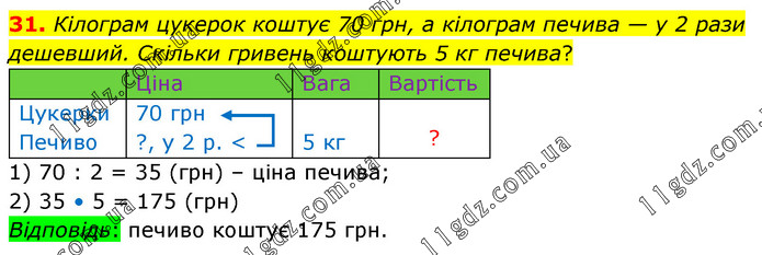 Кілограм цукерок коштує 70 грн, а кілограм печива — у 2 рази дешевший. Скільки гривень коштують 5 кг печива? 1) 70 : 2 = 35 (грн) – ціна печива; 2) 35 • 5 = 175 (грн) Відповідь: печиво коштує 175 грн.