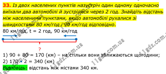Із двох населених пунктів назустріч один одному одночасно виїхали два автомобілі й зустрілися через 2 год. Знайдіть відстань між населеними пунктами, якщо автомобілі рухалися зі швидкостями 80 км/год і 90 км/год відповідно. 1) 90 + 80 = 170 (км) – на стільки вони зближаються щогодини; 2) 170 • 2 = 340 (км) Відповідь: відстань між містами 340 км.