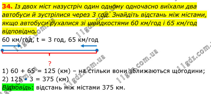 Із двох міст назустріч один одному одночасно виїхали два автобуси й зустрілися через 3 год. Знайдіть відстань між містами, якщо автобуси рухалися зі швидкостями 60 км/год і 65 км/год відповідно. 1) 60 + 65 = 125 (км) – на стільки вони зближаються щогодини; 2) 125 • 3 = 375 (км) Відповідь: відстань між містами 375 км.