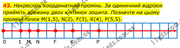 Накресліть координатний промінь. За одиничний відрізок прийміть довжину двох клітинок зошита. Позначте на цьому промені точки М(1,5), N(2), F(3), К(4), Р(5,5).