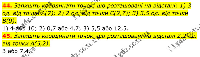 44. Запишіть координати точок, що розташовані на відстані: 1) 3 од. від точки А(7); 2) 2 од. від точки С(2,7); 3) 3,5 од. від точки В(9). 1) 4 або 10; 2) 0,7 або 4,7; 3) 5,5 або 12,5. 45. Запишіть координати точок, що розташовані на відстані 2,2 од. від точки А(5,2). 3 або 7,4.