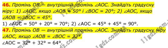 46. Промінь OB — внутрішній промінь ∠AOC. Знайдіть градусну міру: 1) ∠AOC, якщо ∠AOB = 50° і ∠BOC = 20°; 2) ∠AOC, якщо ∠AOB = ∠BOC = 45°. 1) ∠АОС = 50° + 20° = 70°; 2) ∠АОС = 45° + 45° = 90°. 47. Промінь OB — внутрішній промінь ∠АОС. Знайдіть градусну міру ∠AOC, якщо ∠AOB = ∠BOC = 32°. ∠АОС = 32° + 32° = 64°.