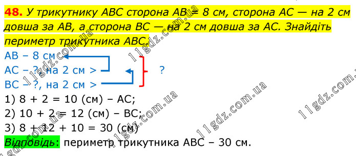 У трикутнику ABC сторона AB = 8 см, сторона AC — на 2 см довша за AB, а сторона BC — на 2 см довша за AC. Знайдіть периметр трикутника ABC. 1) 8 + 2 = 10 (см) – АС; 2) 10 + 2 = 12 (см) – ВС; 3) 8 + 12 + 10 = 30 (см) Відповідь: периметр трикутника АВС – 30 см.