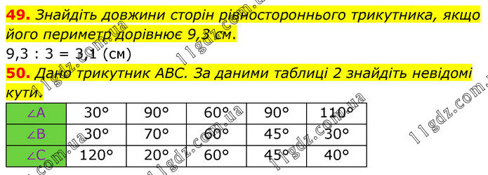 49. Знайдіть довжини сторін рівностороннього трикутника, якщо його периметр дорівнює 9,3 см. 9,3 : 3 = 3,1 (см) 50. Дано трикутник ABC. За даними таблиці 2 знайдіть невідомі кути.