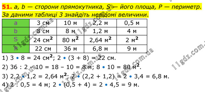 а, b — сторони прямокутника, S — його площа, P — периметр. За даними таблиці 3 знайдіть невідомі величини. 1) 3 • 8 = 24 см2; 2 • (3 + 8) = 22 см. 2) 36 : 2 – 10 = 18 – 10 = 8 м; 8 • 10 = 80 м2. 3) 2,2 • 1,2 = 2,64 м2; 2 • (2,2 + 1,2) = 2 • 3,4 = 6,8 м. 4) 2 : 0,5 = 4 м; 2 • (0,5 + 4) = 2 • 4,5 = 9 м.
