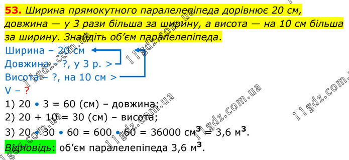 Ширина прямокутного паралелепіпеда дорівнює 20 см, довжина — у 3 рази більша за ширину, а висота — на 10 см більша за ширину. Знайдіть об’єм паралелепіпеда. Ширина – 20 см Довжина – ?, у 3 р. > Висота – ?, на 10 см > V – ? 1) 20 • 3 = 60 (см) – довжина; 2) 20 + 10 = 30 (см) – висота; 3) 20 • 30 • 60 = 600 • 60 = 36000 см3 = 3,6 м3. Відповідь: об’єм паралелепіпеда 3,6 м3.