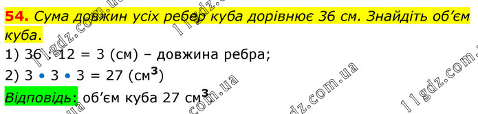Сума довжин усіх ребер куба дорівнює 36 см. Знайдіть об’єм куба. 1) 36 : 12 = 3 (см) – довжина ребра; 2) 3 • 3 • 3 = 27 (см3) Відповідь: об’єм куба 27 см3.
