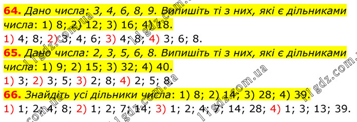 64. Дано числа: 3, 4, 6, 8, 9. Випишіть ті з них, які є дільниками числа: 1) 8; 2) 12; 3) 16; 4) 18. 1) 4; 8; 2) 3; 4; 6; 3) 4; 8; 4) 3; 6; 8. 65. Дано числа: 2, 3, 5, 6, 8. Випишіть ті з них, які є дільниками числа: 1) 9; 2) 15; 3) 32; 4) 40. 1) 3; 2) 3; 5; 3) 2; 8; 4) 2; 5; 8. 66. Знайдіть усі дільники числа: 1) 8; 2) 14; 3) 28; 4) 39. 1) 1; 2; 4; 8; 2) 1; 2; 7; 14; 3) 1; 2; 4; 7; 14; 28; 4) 1; 3; 13; 39.