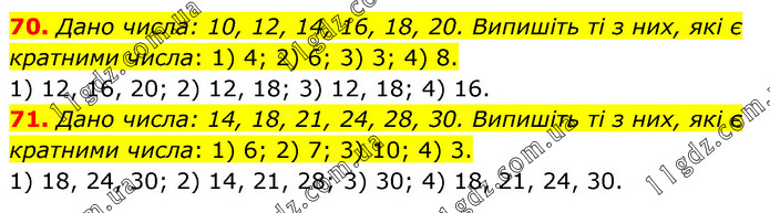 70. Дано числа: 10, 12, 14, 16, 18, 20. Випишіть ті з них, які є кратними числа: 1) 4; 2) 6; 3) 3; 4) 8. 1) 12, 16, 20; 2) 12, 18; 3) 12, 18; 4) 16. 71. Дано числа: 14, 18, 21, 24, 28, 30. Випишіть ті з них, які є кратними числа: 1) 6; 2) 7; 3) 10; 4) 3. 1) 18, 24, 30; 2) 14, 21, 28; 3) 30; 4) 18, 21, 24, 30.