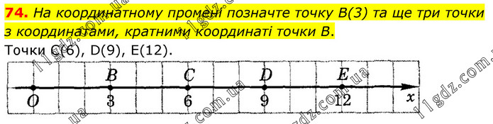 На координатному промені позначте точку В(3) та ще три точки з координатами, кратними координаті точки В. Точки С(6), D(9), Е(12).