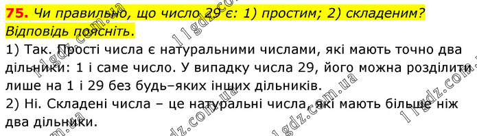 Чи правильно, що число 29 є: 1) простим; 2) складеним? Відповідь поясніть. 1) Так. Прості числа є натуральними числами, які мають точно два дільники: 1 і саме число. У випадку числа 29, його можна розділити лише на 1 і 29 без будь–яких інших дільників. 2) Ні. Складені числа – це натуральні числа, які мають більше ніж два дільники.