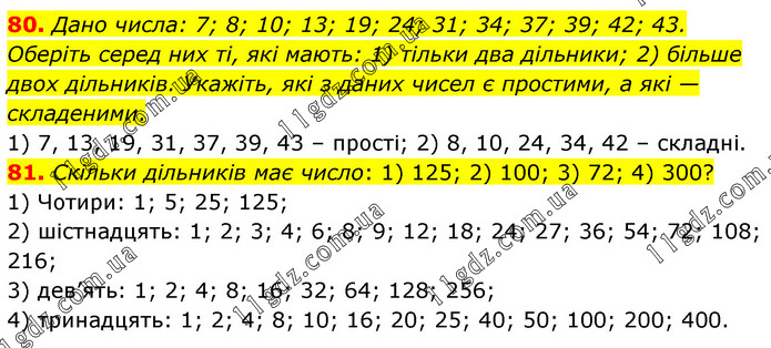 80. Дано числа: 7; 8; 10; 13; 19; 24; 31; 34; 37; 39; 42; 43. Оберіть серед них ті, які мають: 1) тільки два дільники; 2) більше двох дільників. Укажіть, які з даних чисел є простими, а які — складеними. 1) 7, 13, 19, 31, 37, 39, 43 – прості; 2) 8, 10, 24, 34, 42 – складні. 81. Скільки дільників має число: 1) 125; 2) 100; 3) 72; 4) 300? 1) Чотири: 1; 5; 25; 125; 2) шістнадцять: 1; 2; 3; 4; 6; 8; 9; 12; 18; 24; 27; 36; 54; 72; 108; 216; 3) дев’ять: 1; 2; 4; 8; 16; 32; 64; 128; 256; 4) тринадцять: 1; 2; 4; 8; 10; 16; 20; 25; 40; 50; 100; 200; 400.