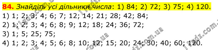 Знайдіть усі дільники числа: 1) 84; 2) 72; 3) 75; 4) 120. 1) 1; 2; 3; 4; 6; 7; 12; 14; 21; 28; 42; 84; 2) 1; 2; 3; 4; 6; 8; 9; 12; 18; 24; 36; 72; 3) 1; 5; 25; 75; 4) 1; 2; 3; 4; 5; 6; 8; 10; 12; 15; 20; 24; 30; 40; 60; 120.