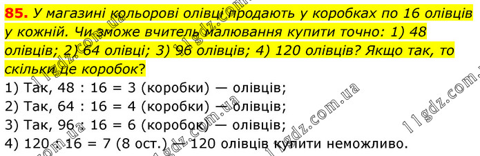 У магазині кольорові олівці продають у коробках по 16 олівців у кожній. Чи зможе вчитель малювання купити точно: 1) 48 олівців; 2) 64 олівці; 3) 96 олівців; 4) 120 олівців? Якщо так, то скільки це коробок? 1) Так, 48 : 16 = 3 (коробки) — олівців; 2) Так, 64 : 16 = 4 (коробки) — олівців; 3) Так, 96 : 16 = 6 (коробок) — олівців; 4) 120 : 16 = 7 (8 ост.) — 120 олівців купити неможливо.