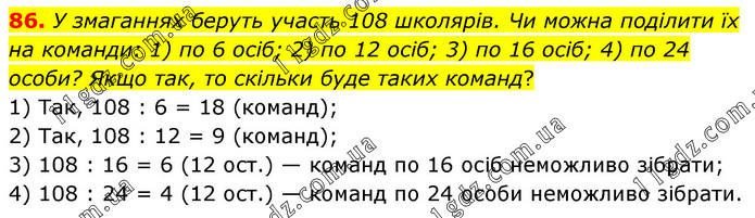 У змаганнях беруть участь 108 школярів. Чи можна поділити їх на команди: 1) по 6 осіб; 2) по 12 осіб; 3) по 16 осіб; 4) по 24 особи? Якщо так, то скільки буде таких команд? 1) Так, 108 : 6 = 18 (команд); 2) Так, 108 : 12 = 9 (команд); 3) 108 : 16 = 6 (12 ост.) — команд по 16 осіб неможливо зібрати; 4) 108 : 24 = 4 (12 ост.) — команд по 24 особи неможливо зібрати.