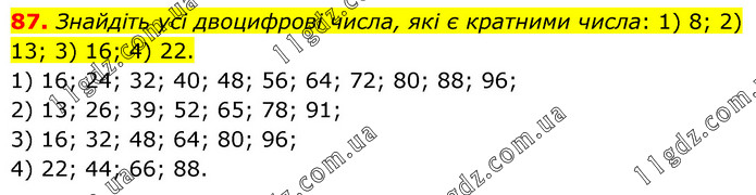 Знайдіть усі двоцифрові числа, які є кратними числа: 1) 8; 2) 13; 3) 16; 4) 22. 1) 16; 24; 32; 40; 48; 56; 64; 72; 80; 88; 96; 2) 13; 26; 39; 52; 65; 78; 91; 3) 16; 32; 48; 64; 80; 96; 4) 22; 44; 66; 88.