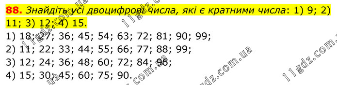 Знайдіть усі двоцифрові числа, які є кратними числа: 1) 9; 2) 11; 3) 12; 4) 15. 1) 18; 27; 36; 45; 54; 63; 72; 81; 90; 99; 2) 11; 22; 33; 44; 55; 66; 77; 88; 99; 3) 12; 24; 36; 48; 60; 72; 84; 96; 4) 15; 30; 45; 60; 75; 90.