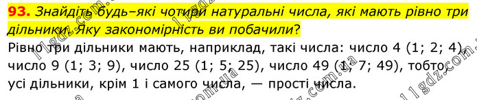 Знайдіть будь–які чотири натуральні числа, які мають рівно три дільники. Яку закономірність ви побачили? Рівно три дільники мають, наприклад, такі числа: число 4 (1; 2; 4), число 9 (1; 3; 9), число 25 (1; 5; 25), число 49 (1; 7; 49), тобто, усі дільники, крім 1 і самого числа, — прості числа.