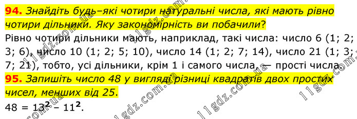 94. Знайдіть будь–які чотири натуральні числа, які мають рівно чотири дільники. Яку закономірність ви побачили? Рівно чотири дільники мають, наприклад, такі числа: число 6 (1; 2; 3; 6), число 10 (1; 2; 5; 10), число 14 (1; 2; 7; 14), число 21 (1; 3; 7; 21), тобто, усі дільники, крім 1 і самого числа, — прості числа. 95. Запишіть число 48 у вигляді різниці квадратів двох простих чисел, менших від 25. 48 = 1З2 – 112.