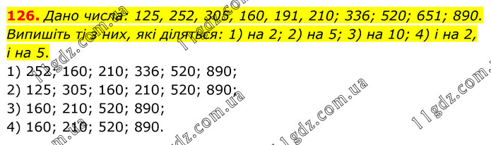 Дано числа: 125, 252, 305, 160, 191, 210; 336; 520; 651; 890. Випишіть ті з них, які діляться: 1) на 2; 2) на 5; 3) на 10; 4) і на 2, і на 5. 1) 252; 160; 210; 336; 520; 890; 2) 125; 305; 160; 210; 520; 890; 3) 160; 210; 520; 890; 4) 160; 210; 520; 890.