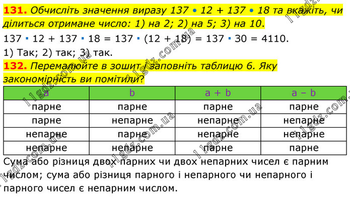 131. Обчисліть значення виразу 137 • 12 + 137 • 18 та вкажіть, чи ділиться отримане число: 1) на 2; 2) на 5; 3) на 10. 137 ∙ 12 + 137 ∙ 18 = 137 ∙ (12 + 18) = 137 ∙ З0 = 4110. 1) Так; 2) так; 3) так. 132. Перемалюйте в зошит і заповніть таблицю 6. Яку закономірність ви помітили? Сума або різниця двох парних чи двох непарних чисел є парним числом; сума або різниця парного і непарного чи непарного і парного чисел є непарним числом.