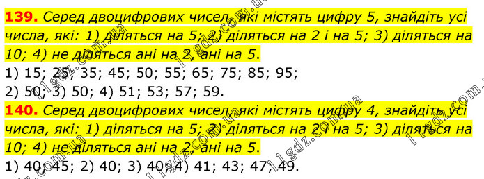139. Серед двоцифрових чисел, які містять цифру 5, знайдіть усі числа, які: 1) діляться на 5; 2) діляться на 2 і на 5; 3) діляться на 10; 4) не діляться ані на 2, ані на 5. 1) 15; 25; 35; 45; 50; 55; 65; 75; 85; 95; 2) 50; 3) 50; 4) 51; 53; 57; 59. 140. Серед двоцифрових чисел, які містять цифру 4, знайдіть усі числа, які: 1) діляться на 5; 2) діляться на 2 і на 5; 3) діляться на 10; 4) не діляться ані на 2, ані на 5. 1) 40; 45; 2) 40; 3) 40; 4) 41; 43; 47; 49.