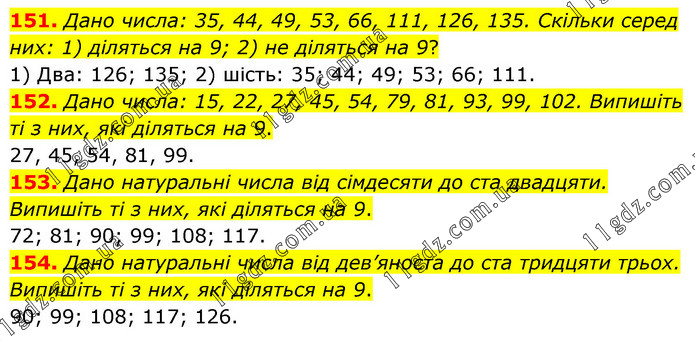 151. Дано числа: 35, 44, 49, 53, 66, 111, 126, 135. Скільки серед них: 1) діляться на 9; 2) не діляться на 9? 1) Два: 126; 135; 2) шість: 35; 44; 49; 53; 66; 111. 152. Дано числа: 15, 22, 27, 45, 54, 79, 81, 93, 99, 102. Випишіть ті з них, які діляться на 9. 27, 45, 54, 81, 99. 153. Дано натуральні числа від сімдесяти до ста двадцяти. Випишіть ті з них, які діляться на 9. 72; 81; 90; 99; 108; 117. 154. Дано натуральні числа від дев’яноста до ста тридцяти трьох. Випишіть ті з них, які діляться на 9. 90; 99; 108; 117; 126.