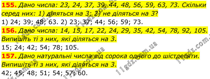 155. Дано числа: 23, 24, 37, 39, 44, 48, 56, 59, 63, 73. Скільки серед них: 1) діляться на 3; 2) не діляться на 3? 1) 24; 39; 48; 63. 2) 23; 37; 44; 56; 59; 73. 156. Дано числа: 14, 15, 17, 22, 24, 29, 35, 42, 54, 78, 92, 105. Випишіть ті з них, які діляться на 3. 15; 24; 42; 54; 78; 105. 157. Дано натуральні числа від сорока одного до шістдесяти. Випишіть ті з них, які діляться на 3. 42; 45; 48; 51; 54; 57; 60.