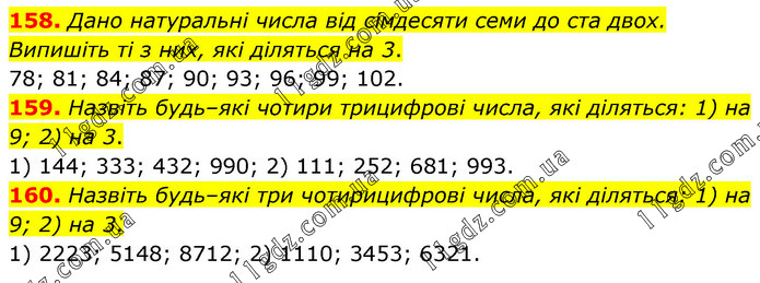 158. Дано натуральні числа від сімдесяти семи до ста двох. Випишіть ті з них, які діляться на 3. 78; 81; 84; 87; 90; 93; 96; 99; 102. 159. Назвіть будь–які чотири трицифрові числа, які діляться: 1) на 9; 2) на 3. 1) 144; 333; 432; 990; 2) 111; 252; 681; 993. 160. Назвіть будь–які три чотирицифрові числа, які діляться: 1) на 9; 2) на 3. 1) 2223; 5148; 8712; 2) 1110; 3453; 6321.