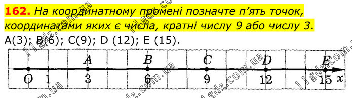 На координатному промені позначте п’ять точок, координатами яких є числа, кратні числу 9 або числу 3. А(3); В(6); С(9); D (12); E (15).