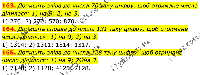 163. Допишіть зліва до числа 70 таку цифру, щоб отримане число ділилося: 1) на 9; 2) на 3. 1) 270; 2) 270; 570; 870. 164. Допишіть справа до числа 131 таку цифру, щоб отримане число ділилося: 1) на 9; 2) на 3. 1) 1314; 2) 1311; 1314; 1317. 165. Допишіть зліва до числа 128 таку цифру, щоб отримане число ділилося: 1) на 9; 2) на 3. 1) 7128; 2) 1128; 4128; 7128.