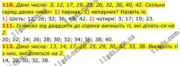 110. Дано числа: 3, 12, 17, 19, 23, 26, 32, 36, 40, 42. Скільки серед даних чисел: 1) парних; 2) непарних? Назвіть їх. 1) Шість: 12; 26; З2; 36; 40; 42. 2) чотири: 3; 17; 19; 23. 111. Із чисел від двадцяти до сорока випишіть ті, які діляться на 2. 20; 22; 24; 26; 28; З0; 32; 34; 36; 38; 40. 112. Дано числа: 13, 14, 17, 20, 25, 29, 30, 32, 33, 38. Випишіть ті з них, які діляться на 2. 14, 20, 30, 32, 38.