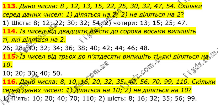 113. Дано числа: 8 , 12, 13, 15, 22, 25, 30, 32, 47, 54. Скільки серед даних чисел: 1) діляться на 2; 2) не діляться на 2? 1) Шість: 8; 12; 22; 30; 32; 54; 2) чотири: 13; 15; 25; 47. 114. Із чисел від двадцяти шести до сорока восьми випишіть ті, які діляться на 2. 26; 28; З0; 32; 34; 36; 38; 40; 42; 44; 46; 48. 115. Із чисел від трьох до п’ятдесяти випишіть ті, які діляться на 10. 10; 20; З0; 40; 50. 116. Дано числа: 8, 10, 16, 20, 32, 35, 40, 56, 70, 99, 110. Скільки серед даних чисел: 1) діляться на 10; 2) не діляться на 10? 1) П’ять: 10; 20; 40; 70; 110; 2) шість: 8; 16; 32; 35; 56; 99.