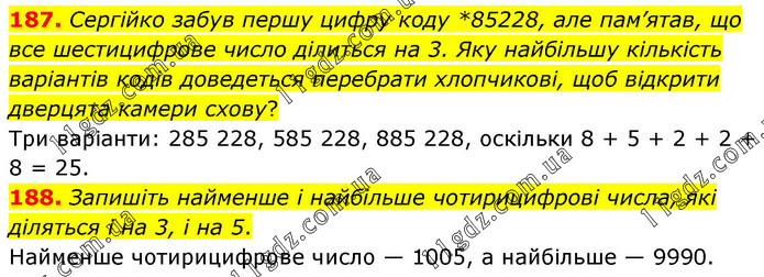 187. Сергійко забув першу цифру коду *85228, але пам’ятав, що все шестицифрове число ділиться на 3. Яку найбільшу кількість варіантів кодів доведеться перебрати хлопчикові, щоб відкрити дверцята камери схову? Три варіанти: 285 228, 585 228, 885 228, оскільки 8 + 5 + 2 + 2 + 8 = 25. 188. Запишіть найменше і найбільше чотирицифрові числа, які діляться і на 3, і на 5. Найменше чотирицифрове число — 1005, а найбільше — 9990.
