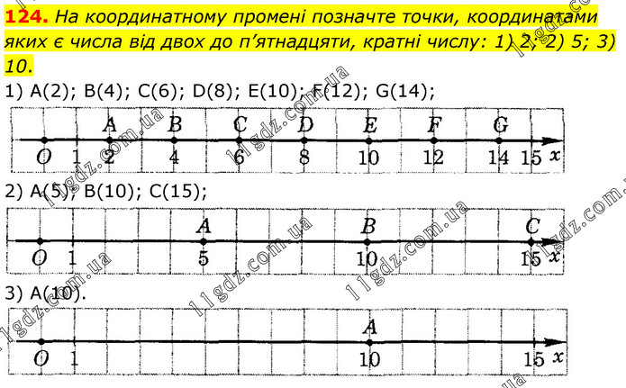 124. На координатному промені позначте точки, координатами яких є числа від двох до п’ятнадцяти, кратні числу: 1) 2; 2) 5; 3) 10. 1) А(2); B(4); С(6); D(8); E(10); F(12); G(14); 2) А(5); В(10); С(15); 3) А(10).
