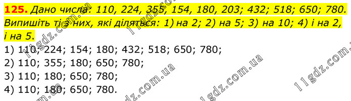 125. Дано числа: 110, 224, 355, 154, 180, 203; 432; 518; 650; 780. Випишіть ті з них, які діляться: 1) на 2; 2) на 5; 3) на 10; 4) і на 2, і на 5. 1) 110; 224; 154; 180; 432; 518; 650; 780; 2) 110; 355; 180; 650; 780; 3) 110; 180; 650; 780; 4) 110; 180; 650; 780.