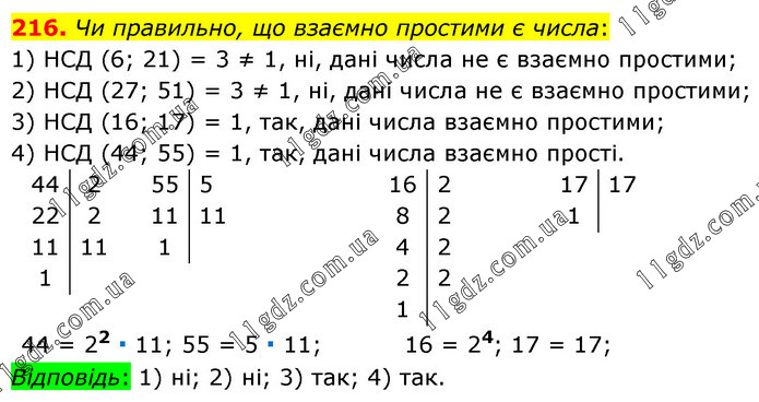 Чи правильно, що взаємно простими є числа: 1) НСД (6; 21) = 3 ≠ 1, ні, дані числа не є взаємно простими; 2) НСД (27; 51) = 3 ≠ 1, ні, дані числа не є взаємно простими; 3) НСД (16; 17) = 1, так, дані числа взаємно простими; 4) НСД (44; 55) = 1, так, дані числа взаємно прості. 44 = 22 ∙ 11; 55 = 5 ∙ 11; 16 = 24; 17 = 17; Відповідь: 1) ні; 2) ні; 3) так; 4) так.