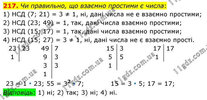 Чи правильно, що взаємно простими є числа: 1) НСД (7; 21) = 3 ≠ 1, ні, дані числа не е взаємно простими; 2) НСД (23; 49) = 1, так, дані числа взаємно простими; 3) НСД (15; 17) = 1, так, дані числа взаємно простими; 4) НСД (15; 27) = 3 ≠ 1, ні, дані числа не є взаємно прості. 23 = 1 ∙ 23; 55 = 32 ∙ 7; 15 = 3 ∙ 5; 17 = 17; Відповідь: 1) ні; 2) так; 3) ні; 4) ні.