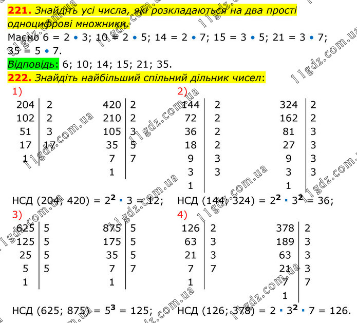 221. Знайдіть усі числа, які розкладаються на два прості одноцифрові множники. Маємо 6 = 2 • 3; 10 = 2 • 5; 14 = 2 • 7; 15 = 3 • 5; 21 = 3 • 7; 35 = 5 • 7. Відповідь: 6; 10; 14; 15; 21; 35. 222. Знайдіть найбільший спільний дільник чисел: НСД (204; 420) = 22 ∙ 3 = 12; НСД (144; 324) = 22 ∙ 32 = 36; НСД (625; 875) = 53 = 125; НСД (126; 378) = 2 ∙ 32 ∙ 7 = 126.