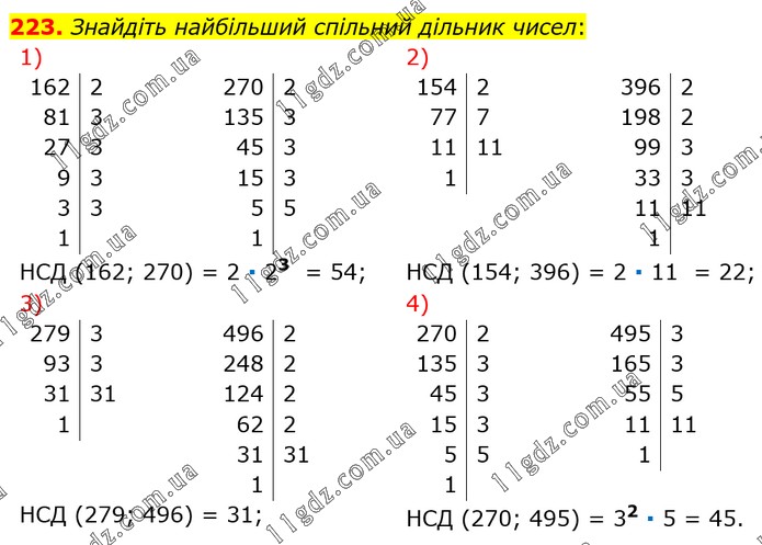 НСД (162; 270) = 2 ∙ 23 = 54; НСД (154; 396) = 2 ∙ 11 = 22; НСД (279; 496) = 31; НСД (270; 495) = 32 ∙ 5 = 45.