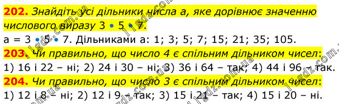 202. Знайдіть усі дільники числа а, яке дорівнює значенню числового виразу 3 • 5 • 7. а = 3 • 5 • 7. Дільниками а: 1; 3; 5; 7; 15; 21; 35; 105. 203. Чи правильно, що число 4 є спільним дільником чисел: 1) 16 і 22 – ні; 2) 24 і 30 – ні; 3) 36 і 64 – так; 4) 44 і 96 – так. 204. Чи правильно, що число 3 є спільним дільником чисел: 1) 12 і 8 – ні; 2) 12 і 9 – так; 3) 15 і 21 – так; 4) 15 і 20 – ні.