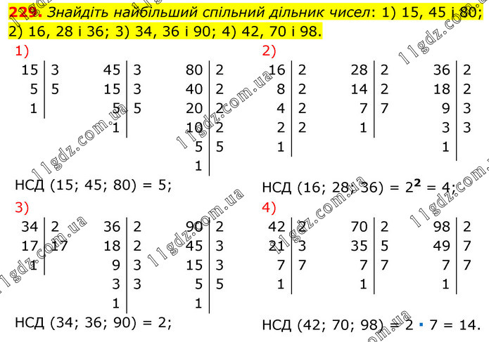 Знайдіть найбільший спільний дільник чисел: 1) 15, 45 і 80; 2) 16, 28 і 36; 3) 34, 36 і 90; 4) 42, 70 і 98. НСД (15; 45; 80) = 5; НСД (16; 28; 36) = 22 = 4; НСД (34; 36; 90) = 2; НСД (42; 70; 98) = 2 ∙ 7 = 14.