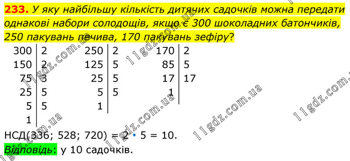 У яку найбільшу кількість дитячих садочків можна передати однакові набори солодощів, якщо є 300 шоколадних батончиків, 250 пакувань печива, 170 пакувань зефіру? НСД(336; 528; 720) = 2 ∙ 5 = 10. Відповідь: у 10 садочків.