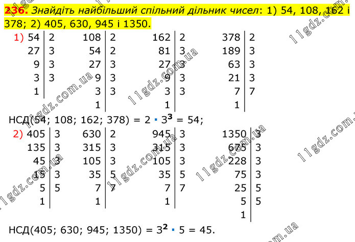 Знайдіть найбільший спільний дільник чисел: 1) 54, 108, 162 і 378; 2) 405, 630, 945 і 1350. НСД(54; 108; 162; 378) = 2 ∙ З3 = 54; НСД(405; 630; 945; 1350) = З2 ∙ 5 = 45.